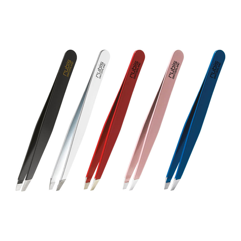 Pince à épiler professionnelle Rubis en biseau de qualité suisse, de fabrication artisanale, en acier inoxydable souple et résistant aux acides. Son envergure pratique, sa stabilité, la souplesse de son matériau ainsi que sa forme ergonomique en font un outil particulièrement maniable. coloris assortis